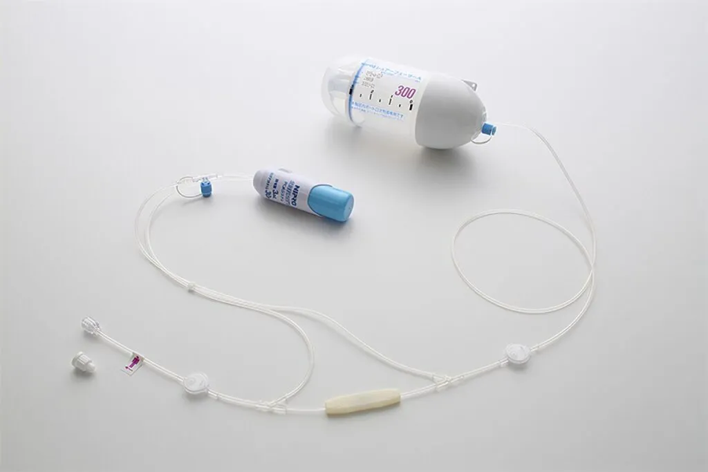 この風船が縮む力を利用して一定速度で患者さんの体の中に薬液が入っていく仕組みです