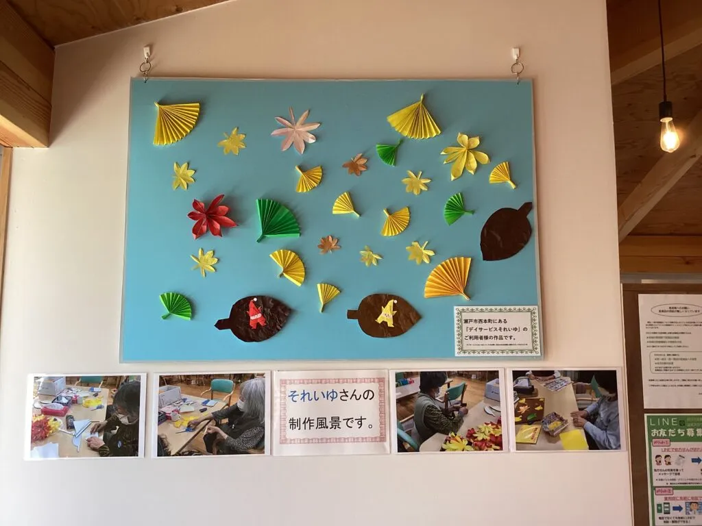 デイサービスでの折り紙やちぎり絵などの作品作りはレクリエーションとしてだけではなく手先を動かしたり、他の利用者さんと会話することは機能訓練の一環となる様です。