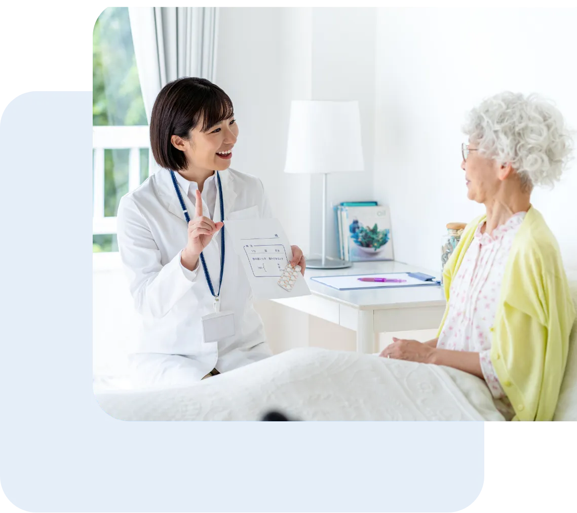 高齢者施設にて生活されている患者様のお薬を薬剤師が施設へお届けし、ご本人様や看護師の方に説明をさせていただきます。また患者様の状態、お薬の使用状況(飲み忘れ、残薬、過不足薬)などの確認をして管理致します。複数の病院を受診されている場合も、薬剤師がしっかり管理し病院同士の情報を共有いたします。
