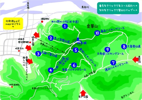 金華山の山頂には、織田信長が天下統一の拠点とした岐阜城があり、10の登山道が整備されており、どのコースも山頂まで30分から1時間で到達できます。ロープウェイでも行くことができるコースもあるので、幅広い年代の方が楽しむことができます。